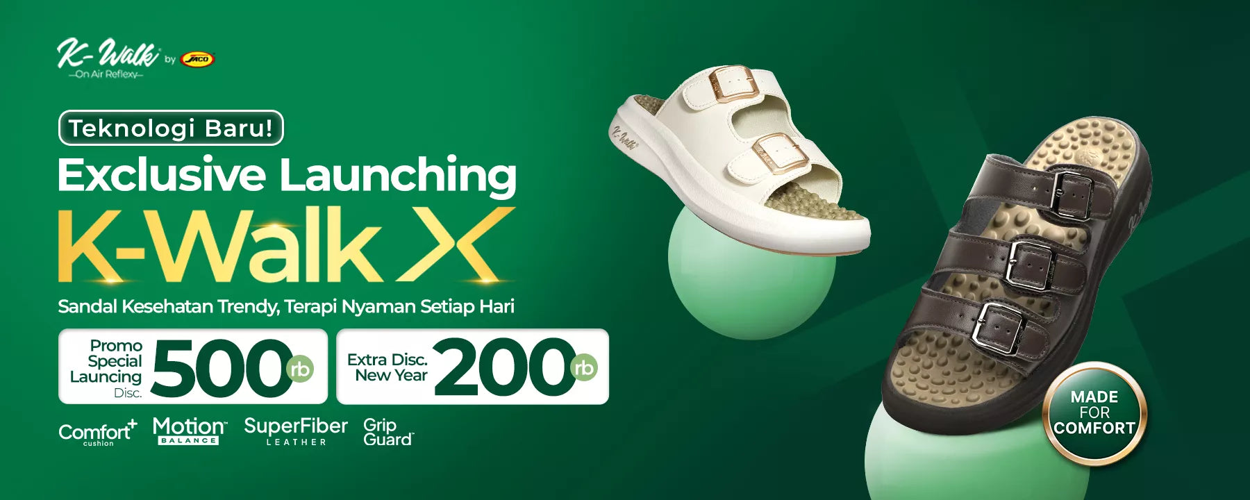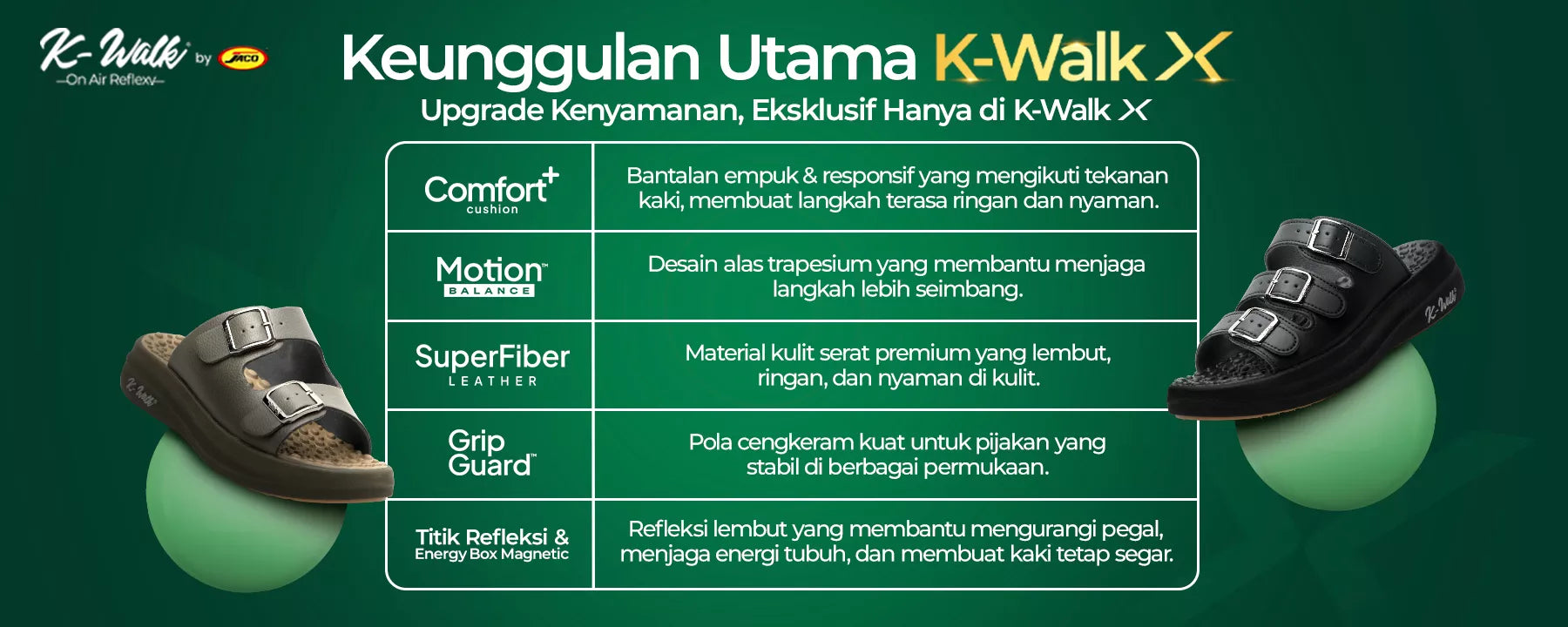 Jangan ragu untuk mencoba sandal terapi kesehatan JACO dan nikmati manfaatnya sehari-hari. K-Walk Energy adalah pilihan yang tepat bagi mereka yang mengutamakan kesehatan dan aktivitas keseharian lebih nyaman.